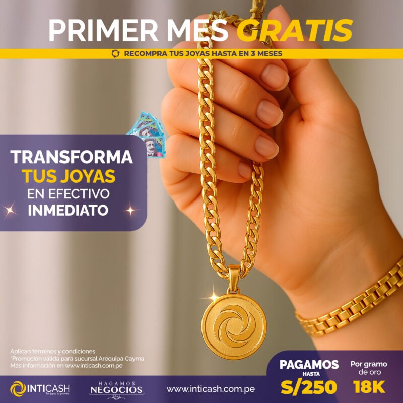 Disfruta la inauguración de Inticash Cayma en Arequipa con una promoción especial: ¡primer mes gratis al dejar tus joyas en contrato! T...
