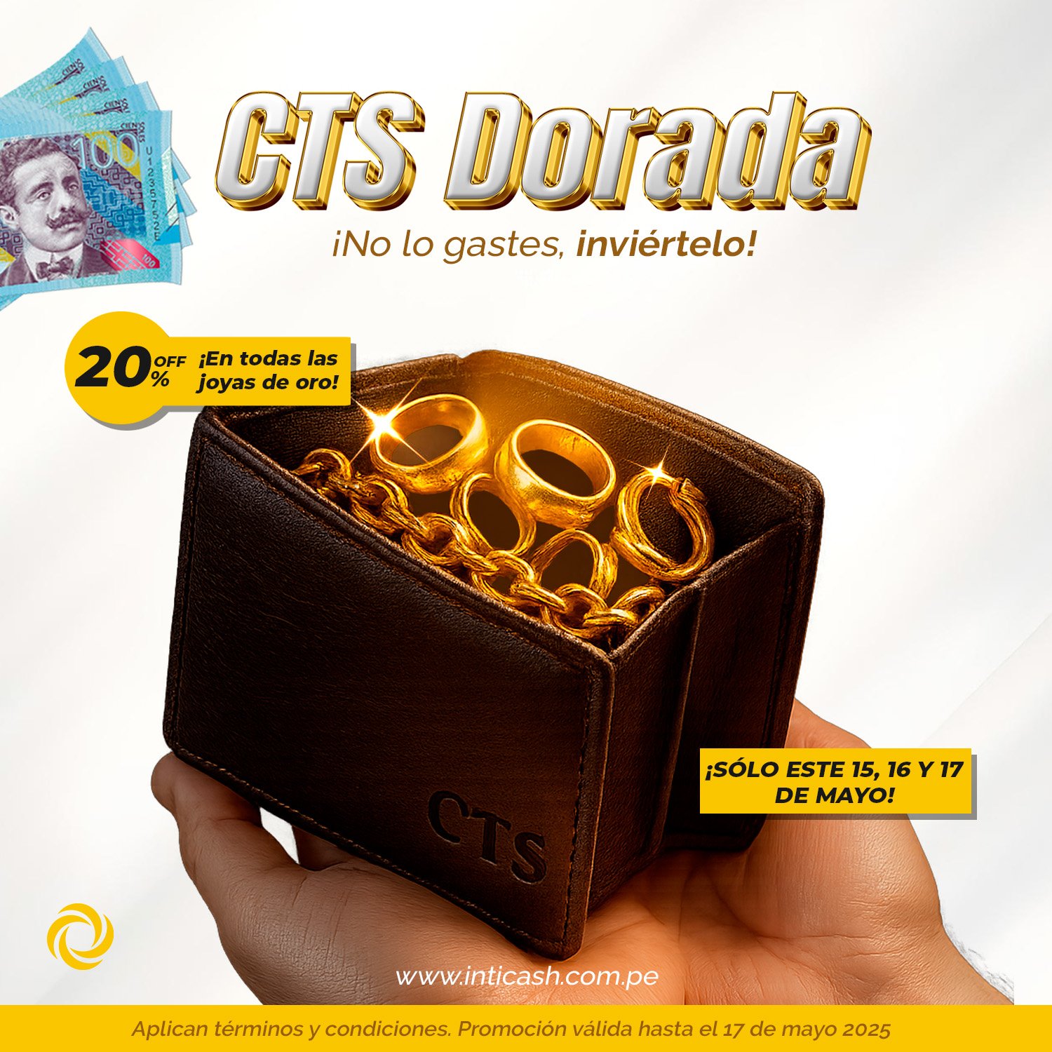 En Inticash te ayudamos a invertir tu CTS de manera inteligente. Durante el 15, 16 y 17 de mayo, disfruta de un 20% de descuento en todas las joyas de oro. Transforma tu CTS en una inversión segura, protegiendo tu dinero frente a la inflación. Joyas de oro de alta calidad, ideales para regalo, uso personal o inversión. No dejes pasar esta oportunidad exclusiva. Promoción válida hasta el 17 de mayo 2025.